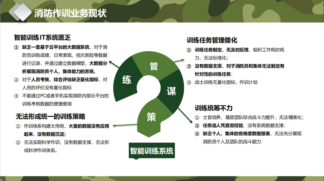 消防部队每天都要进行大量的训练、考核和竞赛等,以提升消防战士的各方面的各项能力,并完整的收集相关数据为决策提供支持;